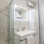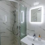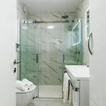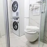 Geniet van het comfort van een badkamer in 2-slaapkamer Modern Cityscape 2-Bedroom Terrace Apartment, dat met een droger en handdoeken is uitgerust. Je vindt er ook een apart toilet en een douche.
